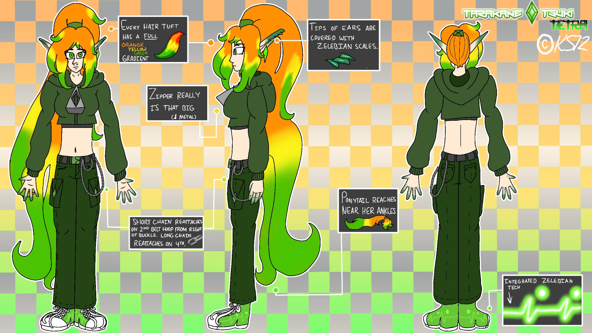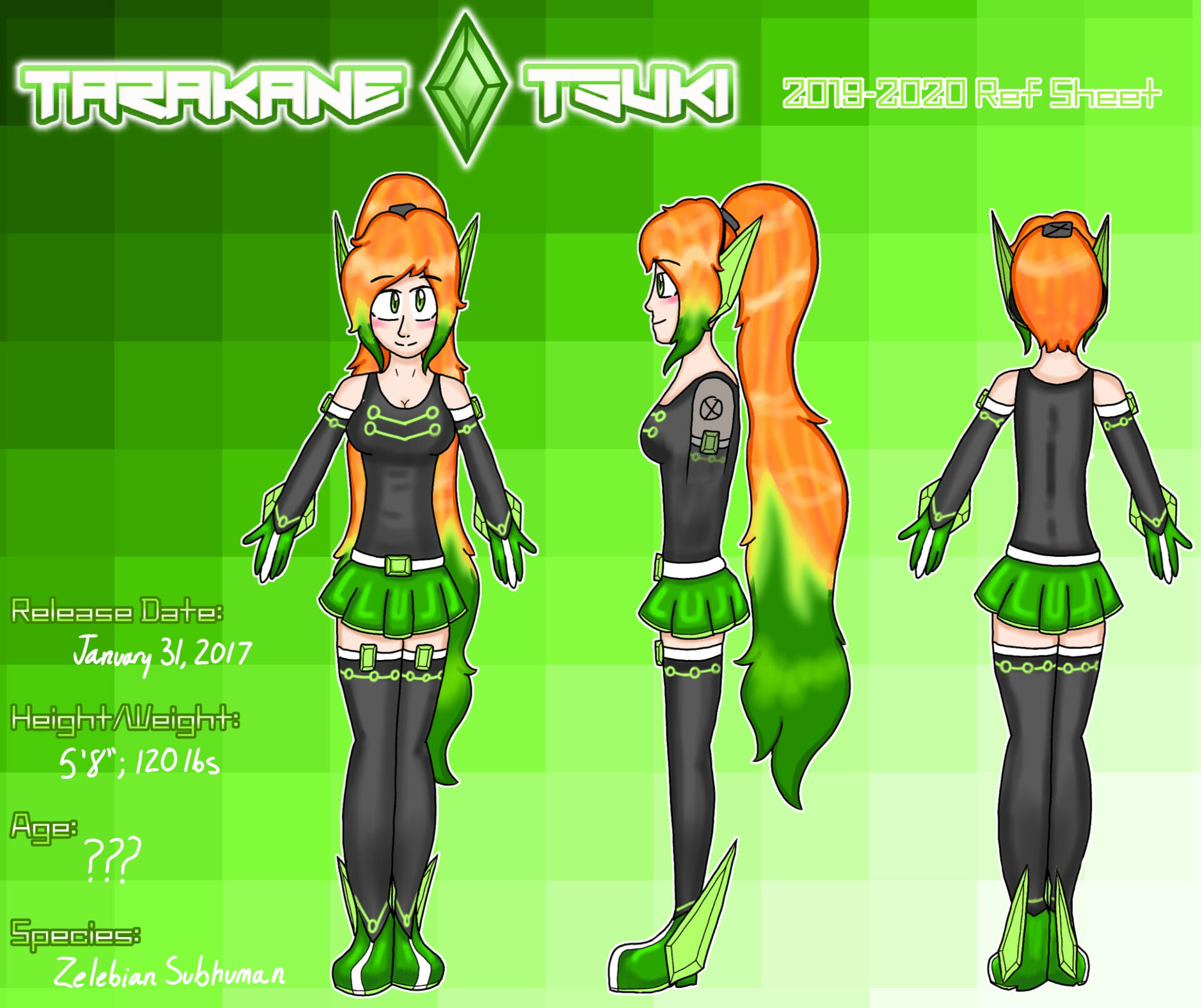 Tarakane Tsuki's TETRA design is her offical main design, and is based off of how she would look after 2 years have passed since she landed upon Earth.During this time, she has taken a liking to grunge and alternative aesthetics, and has familiarized herself enough with Earth to be comfortable in clothing other than her 72-Z suit from Zelebia. She has also discovered how to be true to her own self-image, shown by the first reveal of her ears.Compared to her ACT 1 design, her demeanor has gotten more skeptical and tough, showing a change between her former "dandere" personality and the present.This design will be used for her English voicebanks.