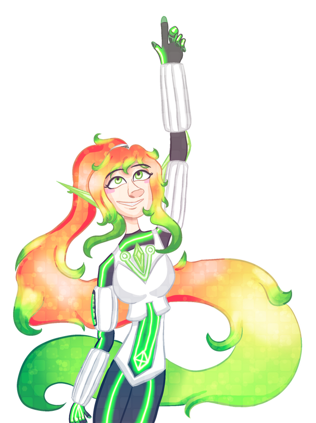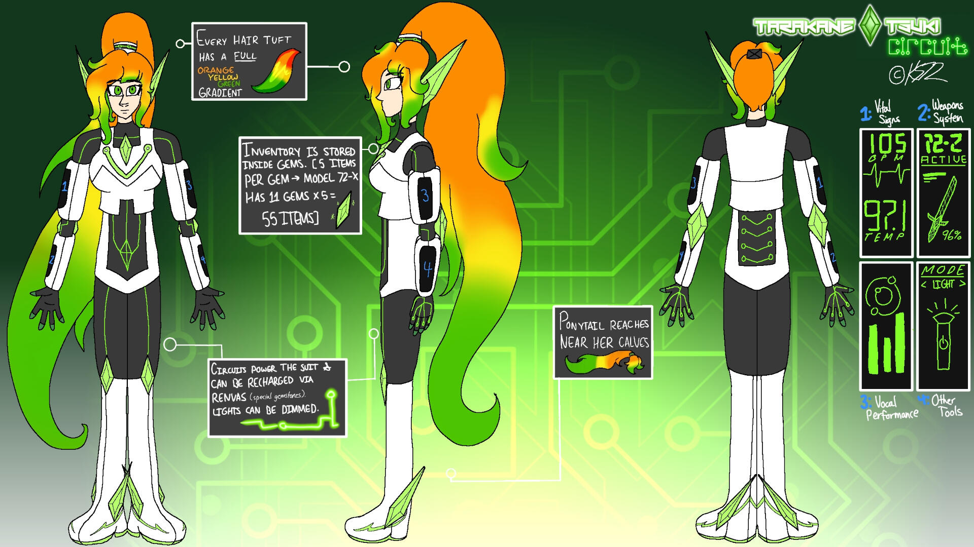 Tarakane Tsuki's CIRCUIT design is her official alternate design, and is based on her outfit used in combat in Zelebia's outlands.According to Zelebian lore, this suit is only obtained by elimination of qualifiers who seek interest in it. Main features of the suit include a battery life of 12 months, integration of monitoring vital signs, holographic shield barriers around areas of the body that are not armored by titanium (indicated by green glowing lines), digital/magical storage inside of each gemstone (headphones included), and a sword for combat.
